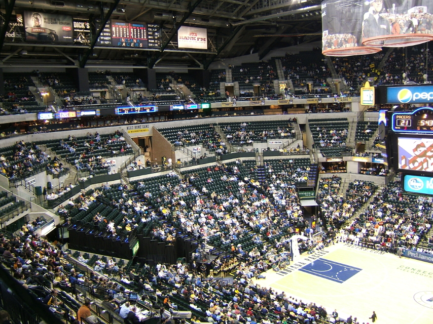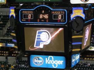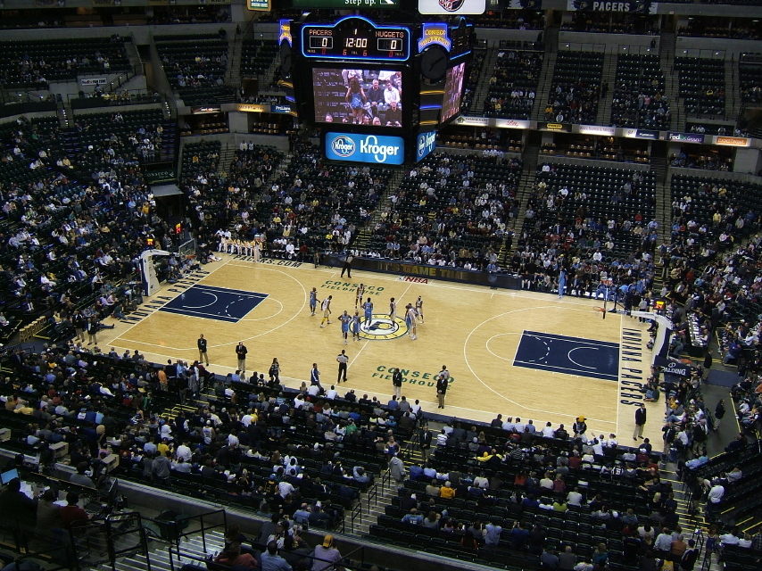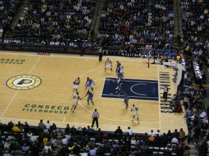 Was ist eigentlich aus der NBA geworden? Ich hab echt einen Schreck bekommen. Zunächst mal war die Halle fast leer, was mich schon überrascht hat. Mir war klar, dass sie bei dieser Partie zwischen den Indiana Pacers und den Denver (Mc)Nuggets nicht ausverkauft sein würde, aber so leer hätte ich nun auch nicht erwartet… Die Saison hat gerade erst angefangen und wenn es Anfang November schon leer ist, dann möchte ich nicht im Januar / Februar dort sein. Traurig, das gab es früher selten und schon mal gar nicht in Indiana. Es hängt sicher auch mit der Wirtschaftskrise hier in den Staaten zusammen, da man schon merkt wo die Leute als erstes kürzen: Beim Livesport