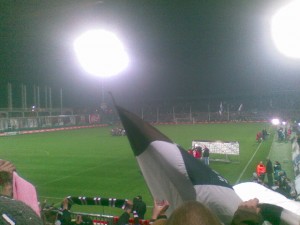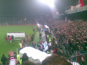 Die Stimmung ist am Millerntor eigentlich immer sehr gut, aber Montag fand ich sie wirklich hervorragend! Normalerweise sind Montagsspiele bei Pauli da immer ein bisschen problematisch, da die meisten Fans diese ablehnen und zu diesen Gelegenheiten dagegen protestieren bzw. sich für mehr Fanrechte einsetzen. Meine persönliche Meinung dazu spielt keine gesteigerte Rolle, aber ich bin grundsätzlich ein Gegner davon der eigenen Mannschaft mit Protestaktionen Nachteile zu verschaffen. Wenn man den Support z.B. minutenlang einstellt, speziell in so einem sehr bedeutenden Spiel, oder die Tribünen unbesetzt lässt, schadet das aus meiner Sicht dem eigenen Team.