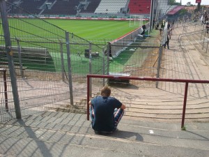 Nach dem kleinen Intermezzo bin ich dann mal in Richtung Nordstehbereich gewackelt. Letztes Jahr war ich mit Stefan gegen Schalke auch auf diesem Stehrang und wir mussten ne Stunde vorher rein, um einigermaßen gute Stehplätze zu bekommen. Der Stehplatzbereich war da immer schon echt gut gefüllt. Ich also zeitig rein. Da meine Freundin zwar die Allergrößte ist, dabei aber eher von kurzer Körperlänge, wollte ich gute Plätze haben, damit sie auch was vom Spiel sehen kann. Eine Stunde vorher war ich jetzt in der zweiten Liga zwar nicht der erste im Block, aber ich würde mal sagen an Position 7. 😉