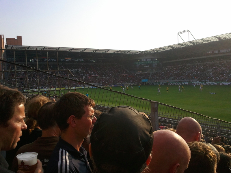 Ich war also gespannt und bin zeitig mit der Ubahn zum Stadion gefahren. Erstes deutliches Zeichen vor Ort, dass es jetzt wieder zweite Bundesliga ist: Es gibt noch Tickets an der Tageskasse! Damit hätte ich eigentlich gar nicht gerechnet, aber es gab Sitzer und Steher und im Endeffekt war das Stadion auch nicht ganz ausverkauft. Undenkbar in der ersten Bundesliga. Da hätte ich mir dann den durchaus vorhandenen Aufwand noch eine zweite Stehplatzkarte für Uschi zu besorgen glatt sparen können.