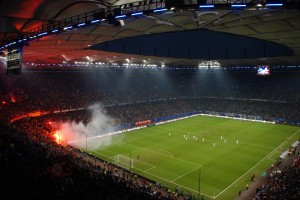 Im Stadion wurden wir dann aber glücklicherweise doch ein bisschen entschädigt. Galatasaray Istanbul hatte die erwartete große Zahl an Fans dabei und türkische Fans sind ja wirklich positiv fanatisch. Zum Teil auch echt gnadenlos, wenn es darum geht in ein Stadium zu kommen. Man konnte z.B. sehen, dass sie einen Großteil der Haupttribüne den Hamburgern wahrscheinlich einfach mit Wahnsinnspreisen abgekauft haben! Da war es doch recht gelb und rot. Dazu kam dann noch ein wirklich großer türkischer Fanblock und das kombiniert mit dem naturgemäß sehr starken Support der HSV Anhänger… Flutlichtspiel, Top-Atmosphäre von Beginn an! Europapokal, Europapokal, Europapokal, Eurooopaaaapokal!