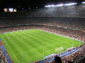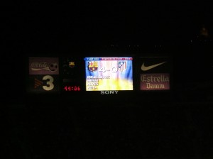 Was man als nächstes verwundert feststellt: Es gibt keine Fanblöcke, keinen Gesang. Ganz oben links neben der Anzeigetafel gibt es so einen eingezäunten Miniblock für die Auswärtsfans. Ein durchaus skuriles Bild: Da stehen in diesem riesigen Rund 500 Athletico Fans in einem kleinen Käfig und versuchen sich von oben gegen die anderen 95.000 Gehör zu verschaffen. Völlig unmöglich natürlich. Ok, also es gibt keine großen Auswärtsblöcke, das hab ich verstanden. 😉 Der Rest des Stadions singt zu Beginn ein lustiges Liedchen und es geht während des Spiels immer so ein Raunen durch die Menge, natürlich werden auch Tore gefeiert und bejubelt, aber so richtige Anfeuerungen oder sowas wie Stimmung entsteht eigentlich nicht. Ich bin gespannt, ob das gegen Real anders sein wird, aber die Atmosphäre beim FC Barcelona ist sonst eher Theater, weniger Fußballstadion wie bei uns. Ich fand es trotzdem toll, weil es halt so anders war, müsste es aber so auch nicht alle 2 Wochen haben.